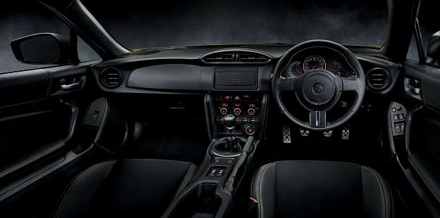 內裝部分同樣以黑色為基調,但換上兩張用Alcantara皮革搭配一般皮革包覆的跑車座椅;此外,車內有皮革包覆之處,包含座椅、方向盤、門板、中控台、排檔頭及手煞車拉柄等處,都使用黃色車縫線妝點,讓車內呈現出有別於一般版86的氛圍。